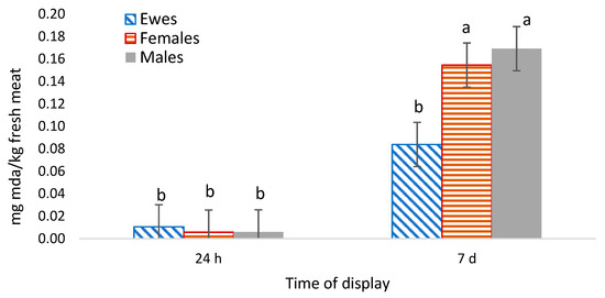 Lipid oxidation (Figure 1) increased over the storage time, as expected [50,51]. There were no differences among types on the first day, but, surprisingly, on day 7 the lambs’ meat presented higher oxidation values than that of the ewes’, although no differences in unsaturated fatty acids sums were detected. However, both lambs’ and ewes’ meat presented very low lipid oxidation values at 7 days, which was much lower than those described by other authors in the meat of the Merino breed aged 7 days [43,50,51].