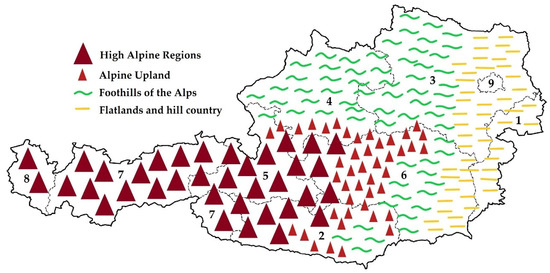 Schematic map of Austria’s geological structure and the nine federal states. Vienna is the capital city of Austria but is also considered a federal state. (1 = Burgenland, 2 = Carinthia, 3 = Lower Austria, 4 = Upper Austria, 5 = Salzburg, 6 = Styria, 7 = Tyrol, 8 = Vorarlberg, 9 = Vienna).