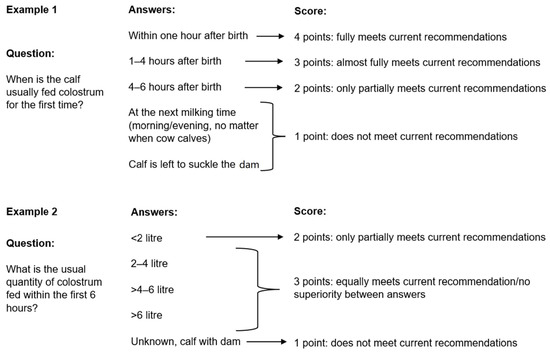 In order to compare herd and calf management practices, a scoring system was implemented for 13 questions (Section 2 and Section 3). A high score agrees with evidence-based recommendations on herd and calf management procedures. A low score indicates that the answers were not in accordance with evidence-based recommendations. Each answer was translated into a point system (minimum point = 0 points; maximum points = 4 points). In total, a maximum of 32 points could be obtained per farm: 14 points for herd management practices and 18 points for calf management practices. The point allocation was based on the current evidence-based recommendations published in peer-reviewed journals. In detail, the information from published peer-reviewed articles was used as a basis for the discussion round by the authors (NH, KL, TW). Answers according to the current evidence-based recommendations were assessed as ‘correct’ and received higher scores (3 and 4 points, mostly or fully meets the evidence-based recommendation) than ‘incorrect’ answers (1 and 2 points, does not or only partially meet evidence-based recommendations). Questions solely ending in a yes/no decision were categorized as a correct (1 point) and an incorrect answer (0 points). If superiority to a specific method/procedure over another could not be determined, an equal number of points was given. For example, Section Two included the information on the udder cleaning method, and two answers were possible (yes/no). The answer “yes—the udder was cleaned before colostrum harvest” resulted in one point, and the answer “no—the udder was not cleaned before colostrum harvest” resulted in zero points. The allocation of points was based on the publication by S. Steward et al. 2005 [33], where the authors found that a high standard of udder cleaning is essential to harvest high-quality colostrum with low bacterial counts. Our survey did not ask about the detailed udder cleaning routine. Therefore, the question about the cleaning method was excluded from the scoring system, and only the question cleaning ‘yes/no’ was scored. Figure 2 provides two more sample questions to illustrate the allocation of points within the scoring system.