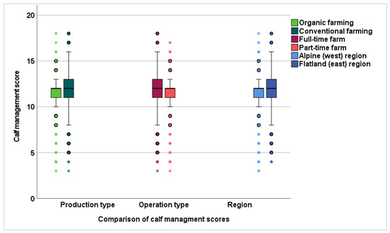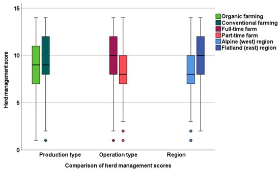 The overall median for Austria in herd management practices was 9 (range 1–14), and in calf management practices, 12 (range 3–18). Comparisons of herd and calf management scores for alpine (west) and foothills/flatland (east) regions, production types (organic versus conventional), and operating types (full-time versus part-time) are shown in Figure 3 and Figure 4.