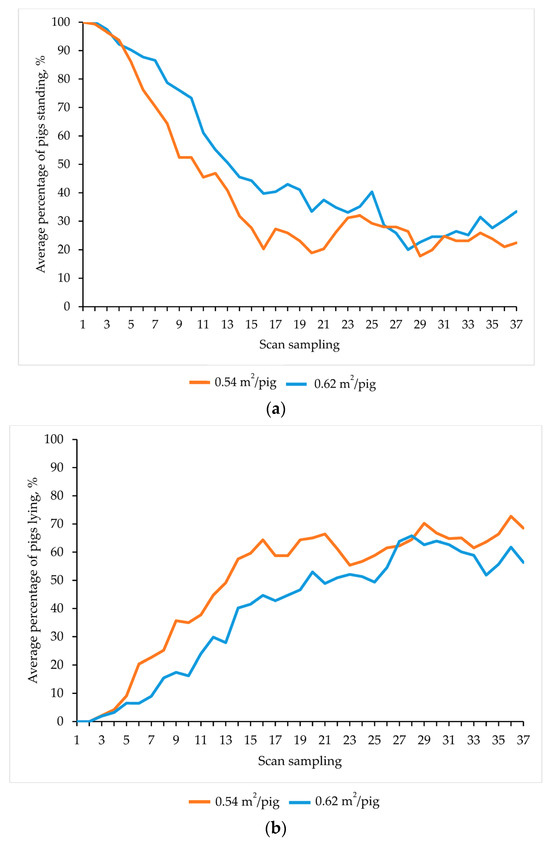 Effects of space allowance on the percentage of pigs standing (a) and lying (b) during the 72 min of lairage observation time (scans every 2 min) in summer.