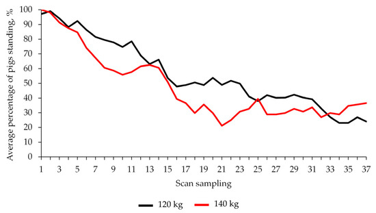 A greater proportion of heavier pigs tended to stand less during the first half and the whole observation time in lairage when compared with lighter pigs (p = 0.08 and p = 0.07 for each period, respectively; Figure 4), although the expression of this posture decreased over time in both pig types. However, this posture was not associated with a variation in lying behaviour, which did not differ between the two groups of pigs (p > 0.10).