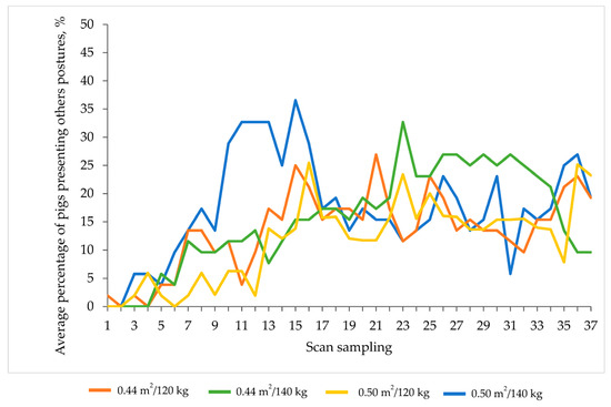 The interaction of space allowance × slaughter weight did not affect postures during lairage (p > 0.10).