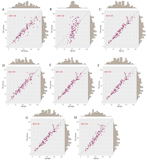 Scatter plots of predicted vs. observed values of the TMY. (A) Wood: gamma incomplete model, (B) GP: Gaussian process, (C) LR: linear regression, (D) MP: multi-layer perceptron, (E) SMOreg: sequential minimal optimization regression, (F) M5: M5 Rules, (G) M5P: model tree, and (H) RF: random forest algorithms.