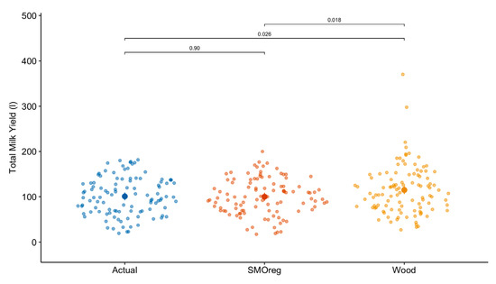 Table 2 shows the mean and significance test of the actual and estimated values of TMY, PY, and TPY using the Wood model and the best ML algorithm (SMOreg). There was a significant difference between the Wood model and SMOreg (p = 0.03) for TMY estimates. The SMOreg algorithm showed a better estimation of TMY with a difference of only 0.82 l compared to the actual value, which is considerably lower than the estimation error shown by the Wood model (14.1 l). In addition, as can be seen in Figure 2, the TMY was considerably overestimated by the Wood model in some lactations.