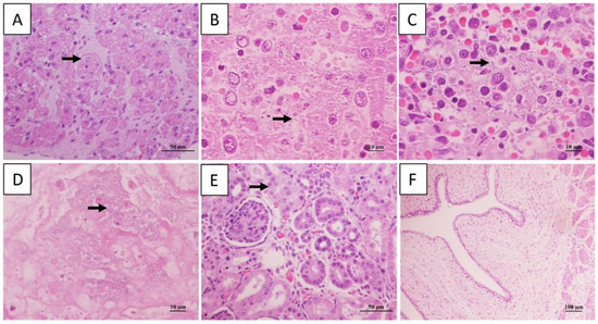 Histopathological changes in dead giant panda. Cardiomyocyte vacuolization in heart (A). Rod-shaped bacteria and necrosis in hepatic (B), and spleen (C). Exudates with bacterial masses in the alveolar space (D). Granular degeneration in epithelial cells of renal tubular (E). No significant changed in umbilical cord (F). The arrow represents the location of the lesion.