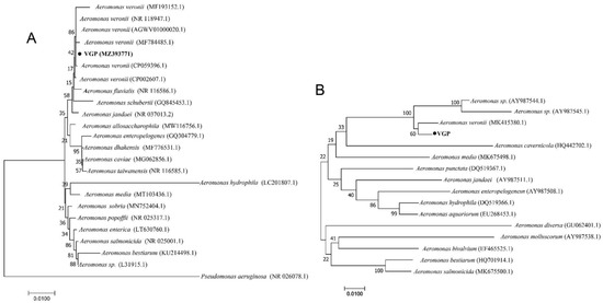 The physiological and biochemical characteristics of the isolate VGP showed that it was Gram-negative, β-hemolytic, and positive to oxidase, lysine decarboxylase. This is consistent with the characteristics of Aeromonas. Due to the wide variety of Aeromonas species, molecular methods are necessary to distinguish different species. 16S rRNA and gyrB are commonly used to identify A. veronii [25,29]. In this study, the phylogenetic analysis of 16S rRNA and gyrB genes demonstrated that isolate VGP belong to A. veronii.