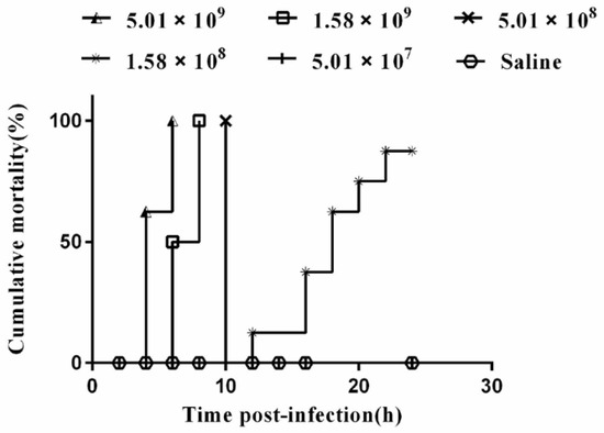 The cumulative mortality of Kunming mice (n = 48) infection strain VGP in 24 h. Each line represents a different concentration of bacterial. The experiment was observed for 7 days. Since deaths do not occur after 24 h p.i, only deaths within 24 h p.i are shown.