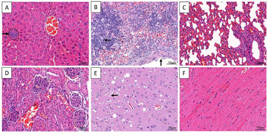 Histological changes in the organs of Kunming mice inoculated with the strain VGP. Basophilic aggregates of bacteria (arrow) and congestion in the sinuses (A). Lymphocyte necrosis (horizontal arrow) and capsular thickening (vertical arrow) in spleen (B). Congestion in lung (C) and in kidney (D). Neuronal necrosis and congestion in brain (E). No significant changes in heart (F).