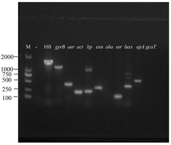 Agarose gel electrophoresis of nine virulent genes (aer, act, lip, exu, aha, ser, luxs, tapA, gcaT) and house-keeping genes (16S rRNA and gyrB) in the strain VGP. M: DNA molecular weight standard; “-”: negative control.