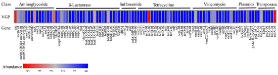 The genomic DNA of the isolate VGP were extracted using a TIANamp Bacterial DNA Kit (Tiangen-Biotech, Beijing, China) following the manufacturer’s instructions. Additionally, the total genomic DNA was used as the template. The Wafergen smart chip real-time PCR system was used to analyze the VGP chromosome antibiotic resistance genes with a total of 97 primer sets (see Supplementary Materials Table S1) [28]. Each sample was repeated three times simultaneously. Following the initial activation of enzymes at 95 °C for 10 min, 30 cycles of the following procedure were used for amplification: denaturation at 95 °C for 30 s, and annealing at 60 °C for 30 s. Then, the results were analyzed using smart chip qPCR software to exclude the wells with multiple melting peaks or amplification efficiency beyond the range (90–110%). The calculation method is based on the previous study [28,29]. Briefly, the mapping data in the relative copy number = copy number (gene)/copy number (16S), in which the copy number (gene) and the copy number (16S) belong to the same sample. Copy number = 10 (33 − CT)/(10/3), i.e., if the offline data have a CT value of null, the CT value is 33, and the copy number value is 1.
