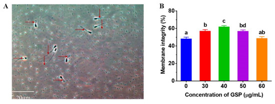 Hypotonic solutions showed that the sperm plasma membrane integrity, swelling of sperm, and convolution of the tail of the sperm represented plasma membrane integrity but were unchanged in the incompleteness of plasma membrane integrity; the sperm plasma membrane integrity of the picture is shown in Figure 1A. The results of the tests of membrane integrity on frozen–thawed bovine sperm are shown in Figure 1B. Compared with the control group, the membrane integrity of frozen–thawed sperm supplemented with 30 µg/mL, 40 µg/mL, and 50 µg/mL were significantly improved (p < 0.05), and the optimum GSPs concentration in bovine semen extender was 40 µg/mL.