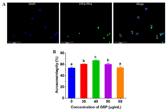 Heads with green fluorescence presented acrosome integrity, which is shown in Figure 2A. The results of the tests of acrosome integrity on frozen–thawed bovine sperm are shown in Figure 2B. Compared with the control group, the acrosome integrity of frozen–thawed sperm supplemented with 30 µg/mL, 40 µg/mL, and 50 µg/mL were significantly improved (p < 0.05), and the optimum GSPs concentration in bovine semen extender was 40 µg/mL.