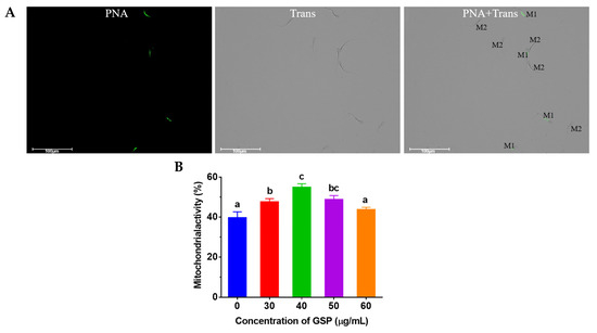 (A) Images of sperm mitochondrial staining. “M1” indicates sperm with mitochondrial activity; “M2” indicates sperm without mitochondrial activity. (B) Effect of different concentrations of GSPs on sperm mitochondrial activity Notes: Values with same lowercase superscript in the same column mean no significant difference (p > 0.05), but values with different lowercase superscript mean significant difference (p < 0.05).