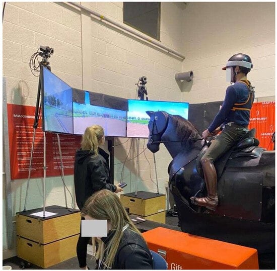 All Para and non-disabled athletes were permitted to observe the motion of the simulator prior to mounting and asked to wear a tightly fitting tunic to which the trunk sensors could be attached. All Para and non-disabled athletes mounted the stationary simulator using a large mounting platform with assistance from the researchers and/or the Para athlete’s accompanying friend/relative/colleague where necessary, and under the instruction and discretion of the participant. Once mounted, each athlete underwent a warm-up period to allow acclimatization to the simulator’s motion, the virtual reality 20 × 40 arena, and the sensitivity of the rein aids. The speed of the simulator (walk, trot, and halt) was controlled by one of two researchers throughout the study (K.N., C.M.), and trotting was optional for grade I Para athletes, as trotting is not included in a grade I dressage test. A maximum of 10 min was permitted for warm-up/acclimatization.