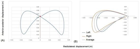 An example of the method used to develop dynamic symmetry measurements for a non-disabled athlete. (A) Dynamic pattern of motion of the pelvis center of mass (COM) in a horizontal plane. The red dot is the midpoint of the pattern. The symmetry vector is represented by the red line from location 0.0. (B) Dynamic symmetry from the midpoint was compared by folding the right side over the left and determining the difference in distance between the left and right sides at each normalized time point.