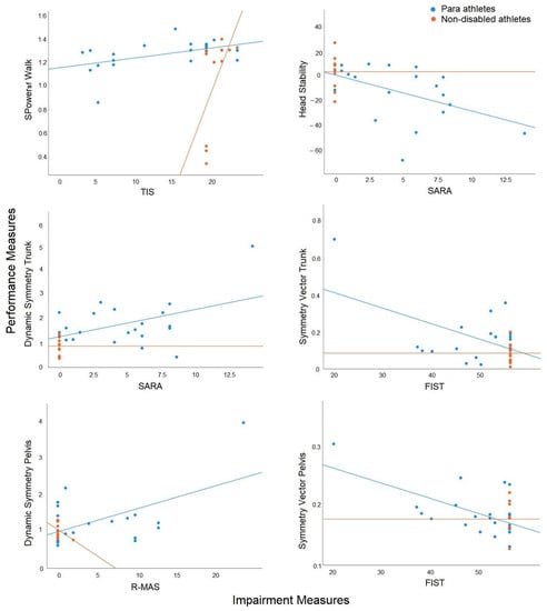 Results of regression analysis showing the significant (p < 0.05) relationships between impairment and performance measures for the Para athlete group (blue), contrasted by the non-significant (p > 0.05) relationships in the non-disabled group (orange).