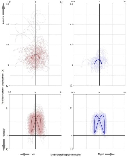 Average (solid-bold) and individual stride (dashed) centre of mass (COM) paths in the horizontal plane (m) of the trunk and pelvis that were used to develop dynamic symmetry measures for Para and non-disabled athlete groups. (A) Para athlete group trunk, (B) non-disabled athlete group trunk, (C) Para athlete group pelvis, and (D) non-disabled athlete group pelvis. The crosshairs are located at 0.0, which is the COM position of the pelvis during the static trial.