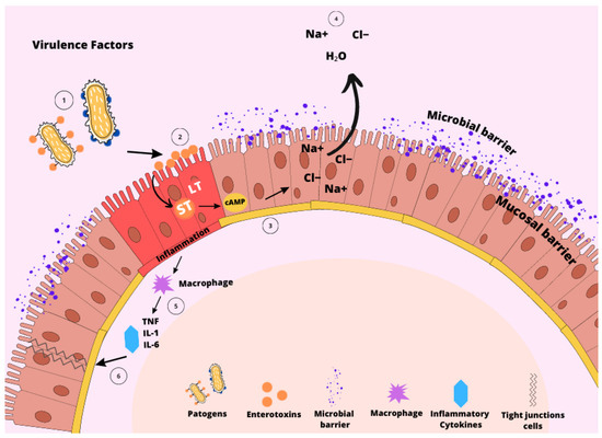 - Dubreuil, J.D. Enterotoxigenic Escherichia coli Targeting Intestinal Epithelial Tight Junctions: An Effective Way to Alter the Barrier Integrity. Microb. Pathog. 2017, 113, 129–134. [Google Scholar] [CrossRef]