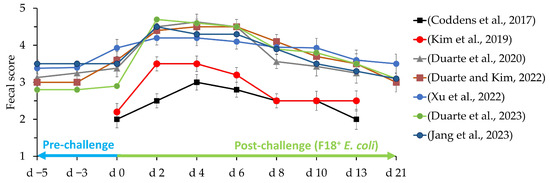 Fecal scores of pigs challenged with F18+ E. coli. Fecal scores: 1: very hard and dry stool, 2: firm stool, 3: normal stool, 4: loose stool, and 5: watery stool with no shape. Adapted from Coddens et al. [65] (1011 CFU), Kim et al. [66] (3 × 1010 CFU), Duarte et al. [67] (6 × 109 CFU), Duarte and Kim [8] (4.6 × 109 CFU), Xu et al. [7] (2.4 × 1010 CFU), Duarte and Kim [16] (5.2 × 109 CFU), Jang et al. [68] (1.2 × 1010 CFU).