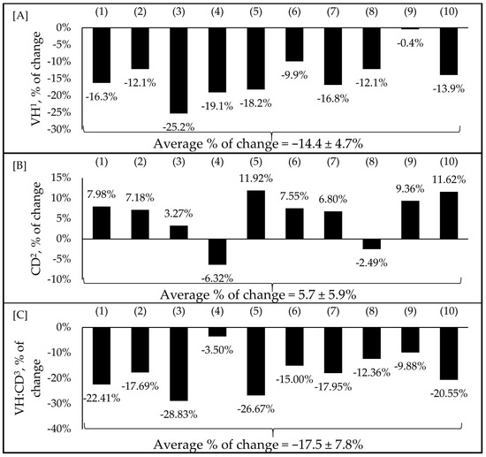 Impacts of F18+ E. coli challenge on villus height (A), crypt depth (B), and villus height to crypt depth ratio (C) of nursery pigs. Selected studies employed F18+ E. coli as the challenge model, encompassing both negative and positive control treatments and reported outcomes related to intestinal morphology. The selected studies were (1) Xu et al. [7], (2) Duarte and Kim [8], (3) Duarte et al. [16], (4) Kim et al. [66], (5) Duarte et al. [67], (6) Jang et al. [68], (7) Sun et al. [76], (8) Li et al. [79], (9) Liu et al. [81], (10) Chang et al. [85]. The percentage of change refers to statistically significant (p < 0.05) and tendency (0.05 ≤ p < 0.10) effects of F18+ E. coli compared with the negative control on the intestinal morphology reported from each respective study. 1 Villus height. 2 Crypt depth. 3 Villus height to crypt depth ratio.