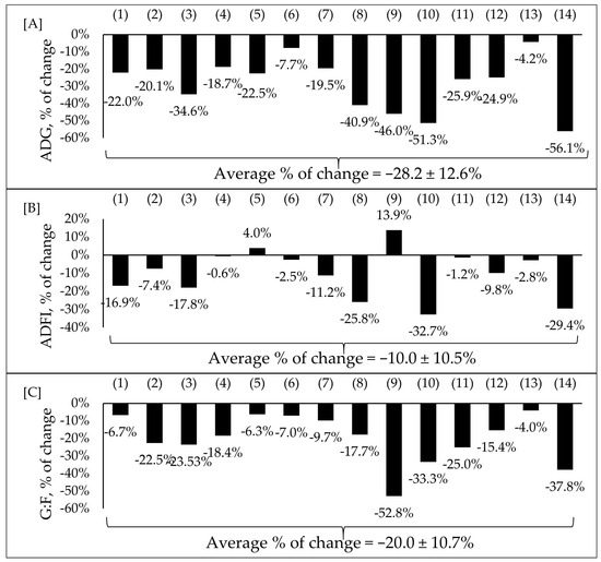 Impacts of F18+ E. coli challenge on average daily gain (ADG) (A), average daily feed intake (ADFI) (B), and gain-to-feed ratio (G:F) (C) of nursery pigs. Selected studies employed F18+ E. coli as the challenge model, encompassing both negative and positive control treatments and reported outcomes related to growth performance. The selected studies were (1) Xu et al. [7], (2) Duarte et al. [16], (3) Kim et al. [66], (4) Duarte et al. [67], (5) Jang et al. [68], (6) Sun et al. [76], (7) Wong et al. [77], (8) Li et al. [79], (9) Liu et al. [81], (10) Becker et al. [83], (11) Chang et al. [85], (12) He et al. [86], (13) Jerez-Bogota et al. [87], (14) Caprarulo et al. [88]. The percentage of change refers to statistically significant (p < 0.05) and tendency (0.05 ≤ p < 0.10) effects of F18+ E. coli compared with the negative control on the growth performance reported from each respective study.