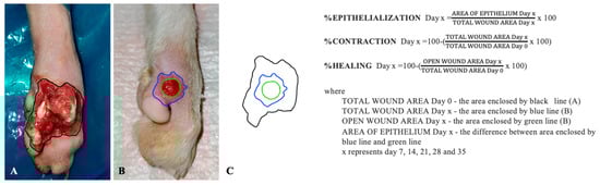 The formula for epithelialization, contraction and healing evaluation. (A) Total wound area in day 0—the area enclosed by black line; (B) Total wound area in day x—the area enclosed by blue line; Open wound area day x—the area enclosed by green line; (C) Area covered by new epithelium in day x—the difference between area enclosed by blue line and green line; x represents day 7, 14, 21, 28 and 35.