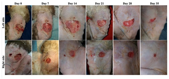 All data were reported as mean ± STDEV. Data were statistically analyzed with a paired Student’s T test and only p values < 0.05 were reported as relevant. (p < 0.05, >0.01—relevant; p < 0.01, >0.001—very relevant; p < 0.001—highly relevant; p > 0.05—irrelevant). The contraction, healing and epithelialization percentages obtained for days 7, 14, 21, 28 and 35 were reported compared to the percentage obtained for the previous treatment session. For day 0, the percentage was considered 0%.