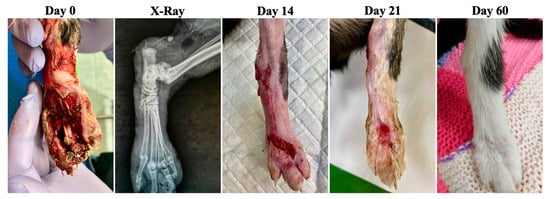 Case 6 was represented by a 6-year-old male cat with an acute wound at the level of the left hind limb at the medial tibial region caused by a car accident (Figure 8). Radiologically, the following aspects were observed: distal fracture of the left tibia and multiple comminuted fractures of the phalanx. It was decided to stabilize the tibial fracture, as well as amputate the phalanges of the third finger. The primary closure of the phalangeal wound was impossible so a second intention of healing of the 4.7 cm2 wound was performed. The bacteriological examination was negative and no antibiotic was used before or during ozone treatment.