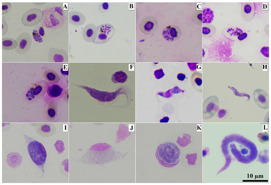 Photomicrographs of blood parasites present in buffy coat smears from domestic chickens (Gallus gallus domesticus). Erythrocytic meront of Plasmodium gallinaceum GALLUS01 (A–E), trypomastigote of avian Trypanosoma sp. (F–H) and gametocytes of Leucocytozoon sp.: elongate macrogametocyte (I), elongate microgametocyte (J) round macrogametocyte (K) and microfilaria of filarial nematodes (L). Methanol-fixed and stained with 10% Giemsa solution.