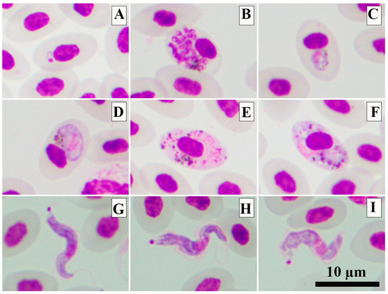 The photomicrographs of Plasmodium gallinaceum GALLUS01 (A–E) and Trypanosoma sp. (G–I) present in blood smears from domestic chickens. Trophozoite (A), mature erythrocytic meront (B), growing gametocyte (C), mature microgametocyte (D) and mature macrogametocytes (E,F). Trypomastigotes of Trypanosoma sp. (G–I). Methanol-fixed and stained with 10% Giemsa solution.