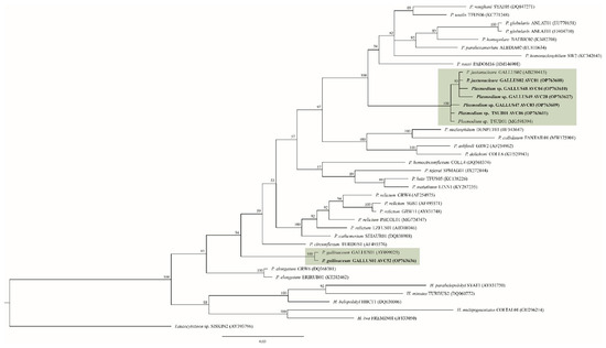 In the Bayesian phylogenetic analysis, the five Plasmodium lineages identified in the present study were grouped in the P. juxtanucleare clade, and they were separated from P. gallinaceum clade (Figure 3). In these two clades, Plasmodium parasites of Phasianidae birds were separated from avian Plasmodium lineages from other host families. The homology in the P. juxtanucleare clade was 99.33–100%, whereas in the P. gallinaceum it was 100%. Plasmodium lineages GALLUS48 and GALLUS49 were closely related to P. juxtanucleare GALLUS02, with 99.78% and 99.55% similarity. In contrast, the Plasmodium lineage GALLUS47 showed 100% similarity to Plasmodium lineage TSUB01.