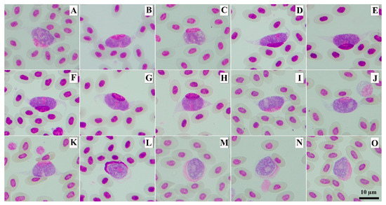 The photomicrographs of Leucocytozoon sp. macrogametocytes developed into fusiform host cells–parasite complexes (A–K) and roundish host cell–parasite complexes (L). Methanol-fixed and stained with 10% Giemsa solution. Leucocytozoon lineage GALLUS55 (K,O), GALLUS61 (A), GALLUS62 (I,M) and undescribed lineage (B–H,J,L,N).