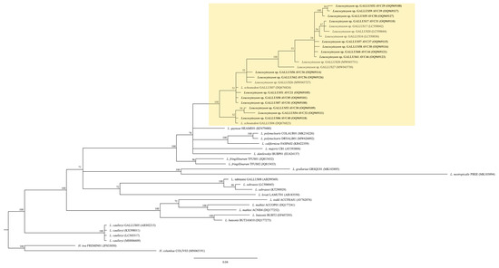 Leucocytozoon spp. bayesian phylogeny based on a fragment of cytochrome b gene (479 bp). The lineages isolated in this study are given in bold. Parasite lineages and isolation number are given after species names. GenBank accession numbers are given between brackets. Node values indicate percentages of posterior probabilities. L. schouteni clade is highlighted in yellow. Haemoproteus iwa lineage FREMIN01 and H. columbae COLIV03 were the outgroup.