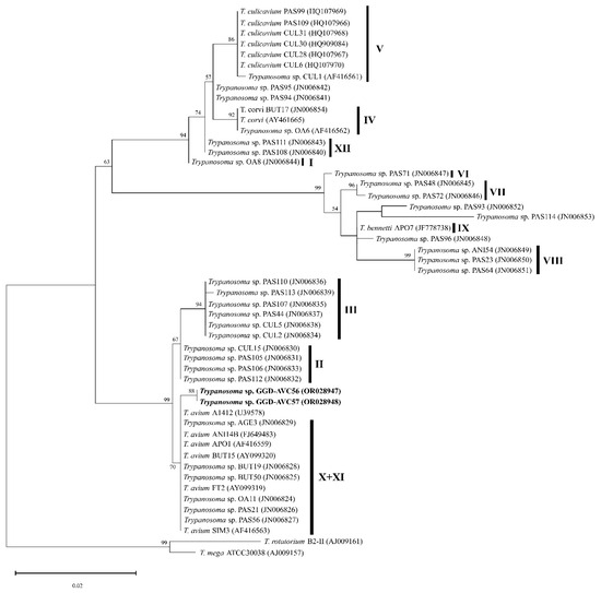 Trypanosoma spp. Maximun-likelihood phylogeny inference based on a fragment of the small subunit rRNA gene (798 bp). The sequences isolated in this study are given in bold. Vertical bars indicate the group of avian trypanosomes lineages (I–XII) following Zídková et al. (2012) [27]. Bootstrap values > 50% are shown at the branch points.