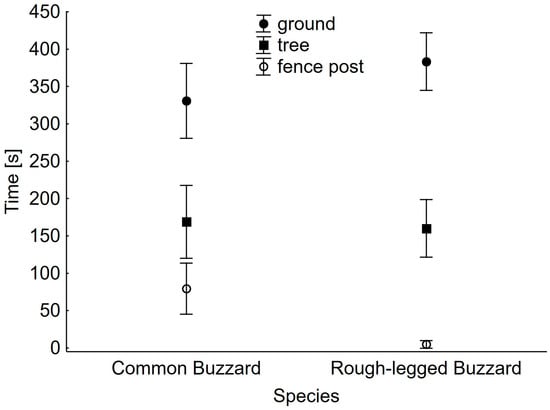 Both buzzard species spent most of their time standing on the ground, less perching on trees, and the least perching on fence posts (Figure 2). Only the difference between perching time on fence posts was significant between species (Table 2). Rough-legged Buzzards conspicuously avoided such hunting sites (Figure 2).