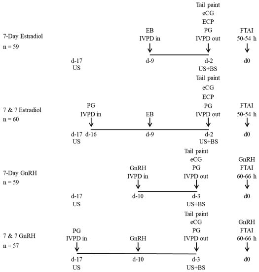 Multiparous (4–6 years of age) postpartum Red Angus suckled cows, weighing 504 ± 30 kg, with an average BCS of 3.7 ± 0.4 and 69 ± 11 d postpartum were enrolled in this experiment. Treatments and activities performed during Experiment 1 are shown in Figure 1. Cows were randomly assigned to one of four treatments: (i) 7-day estradiol (n = 59), 2 mg i.m. of estradiol benzoate (EB; BIOESTROGEN®, Biogénesis Bagó, Garin, Argentina) + IVPD containing 1.0 g of progesterone (CRONIPRES, Biogénesis Bagó, Garín, Argentina) on Day 9 then 1 mg of estradiol cypionate (ECP; CRONI-CIP, Biogénesis Bagó, Garín, Argentina) with 150 µg i.m. of D-Cloprostenol (PG; ENZAPROST DC, Biogénesis Bagó, Garín, Argentina) and 300 IU i.m. of equine chorionic gonadotropin, (eCG; ECEGON®, Biogénesis Bagó, Garín, Argentina) at IVPD removal on Day 2; (ii) 7-day GnRH (n = 59), 10.5 µg i.m. of buserelin acetate (GnRH; GONAXAL®, Biogénesis Bagó, Garín, Argentina) + IVPD on Day 10 then PG and eCG at IVPD removal on Day 3 and GnRH on Day 0; (iii) 7 & 7 estradiol (n = 60), PG + IVPD insertion on Day 16 then EB on Day 9, followed by ECP, PG and eCG at IVPD removal on Day 2; (iv) 7 & 7 GnRH (n = 57), PG + IVPD on Day 17 then GnRH on Day 10, followed by PG and eCG at IVPD removal on Day 3 and GnRH on Day 0. Cows underwent FTAI on Day 0, 50–54 h after IVDP removal for 7-day estradiol and 7 & & estradiol protocols or 60–66 h after IVPD removal for 7-day GnRH and 7 & 7 GnRH protocols.