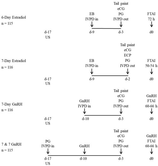 - Bonacker, R.C.; Stoecklein, K.S.; Locke, J.W.C.; Ketchum, J.N.; Knickmeyer, E.R.; Spinka, C.M.; Poock, S.E.; Thomas, J.M. Treatment with prostaglandin F2α and an intravaginal progesterone insert promotes follicular maturity in advance of gonadotropin–releasing hormone among postpartum beef cows. Theriogenology 2020, 157, 350–359. [Google Scholar] [CrossRef]