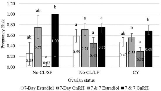 Least squares means for pregnancy risk estimated according to fixed-time artificial insemination (FTAI) protocol and ovarian status at initiation of the FTAI protocol (Experiment 1). The percentage of cows with a CL (CY) was 64.4, 64.4, 61.6 and 66.6% for 7-day estradiol, 7-day GnRH, 7 & 7 estradiol and 7 & 7 GnRH, respectively. The percentage of cows without a CL with a follicle ≥ 10 mm was (No-CL/LF) were 28.8, 28.8, 33.3 and 28.1% for 7-day estradiol, 7-day GnRH, 7 & 7 estradiol and 7 & 7 GnRH, respectively. The percentage of cows without a CL with follicles < 10 mm (No-CL/SF) was 6.7, 6.7, 5.0 and 5.2% for 7-day estradiol, 7-day GnRH, 7 & 7 estradiol and 7 & 7 GnRH, respectively. Pregnancy status was determined by transrectal ultrasonography 35 to 45 d after FTAI. a,b Bars with different superscripts within each cluster differ (p < 0.05).