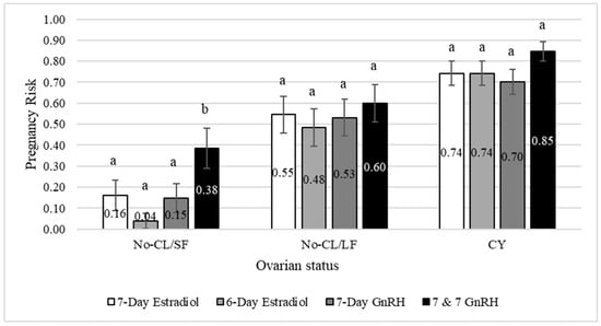 Least squares means for pregnancy risk estimated according to fixed-time artificial insemination (FTAI) protocol and ovarian status at initiation of the FTAI protocol (Experiment 2). The percentage of cows with a CL (CY) was 50.1, 50.4, 49.1 and 51.3% for 6-day estradiol, 7-day estradiol, 7-day GnRH and 7 & 7 GnRH, respectively. The percentage of cows without a CL with a follicle ≥ 10 mm (No-CL/LF) was 28.4, 26.9, 27.5 and 26.0% for 6-day estradiol, 7-day estradiol, 7-day GnRH and 7 & 7 GnRH, respectively. The percentage of and cows without a CL with follicles < 10 mm (No-CL/SF) was 21.5, 22.7, 23.3 and 22.6% for 6-day estradiol, 7-day estradiol, 7-day GnRH and 7 & 7 GnRH, respectively. Pregnancy status was determined by transrectal ultrasonography 35 to 45 d after FTAI. a,b Bars with different superscripts within each cluster differ (p < 0.05).