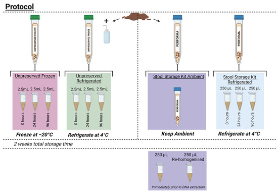 Protocol for sample processing. Stool was aliquoted into two Falcon tubes labelled ‘unpreserved frozen’ and ‘unpreserved refrigerated’, and into two commercial stool storage kits labelled ‘stool storage kit (SSK) ambient’ and ‘SSK refrigerated’. Between 891–1230 mg of stool was aliquoted per tube. Molecular-grade sterile water was added into the unpreserved stool tubes in a ratio of 1 mL water:100 mg stool to create a faecal slurry. The stool storage kit tubes contained a set volume of preservative liquid. All tubes were manually homogenised for 30 s. From the unpreserved stool in the Falcon tubes, 2.5 mL of faecal slurry was aliquoted into three microcentrifuge tubes, each to be placed into storage at different time-points (0, 24, and 96 h). Aliquots (250 µL) were taken from the SSK refrigerated tube, as per the manufacturer’s recommendations. Aliquots from the ‘unpreserved refrigerated’ and ‘SSK refrigerated’ conditions were placed at 4 °C at the specified time-points. Aliquots from the ‘unpreserved frozen’ condition were placed at −20 °C at the specified time-points. The SSK ambient tube remained at ambient temperature for two weeks and two 250 µL aliquots were taken immediately prior to DNA extraction; one aliquot was taken before the tube was re-homogenised; the other was taken after re-homogenisation as per manufacturer recommendations. Figure created in Biorender.