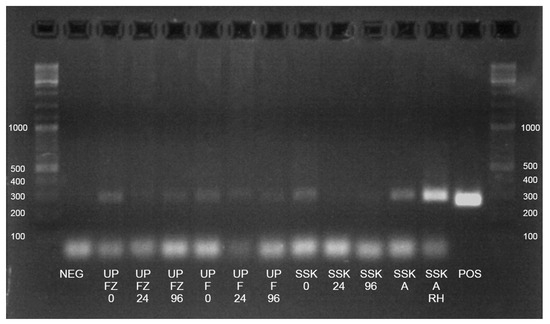 Agarose gel electrophoresis (2% agarose) of PCR-amplified products from a Salmonella Typhimurium artificially spiked cow faecal sample (1 mL liquid Salmonella Typhimurium culture, OD600 = 1, 2 × 108 CFU/mL) stored under different conditions using a Salmonella-species-specific PCR primer set. Lanes are labelled by the sample names. Abbreviations are as follows: NEG, negative control; UP FZ 0, 24, 96 = unpreserved frozen 0, 24, 96 h; UP F 0, 24, 96 = unpreserved refrigerated 0, 24, 96 h; SSK 0, 24, 96 = stool storage kit (SSK) refrigerated 0, 24, 96 h; SSK A = SSK ambient; SSKA RH = SSK ambient re-homogenised; POS = positive control. 0, 24, and 96 indicate time spent at ambient temperature before refrigerating or freezing. A DNA ladder with a range of 100–10,000 bp was placed on the end of each row (GeneRuler DNA ladder mix, ThermoFisher Scientific). Positive bands are those which are present above the negative control. Original gel images can be found in the Supplementary Materials.