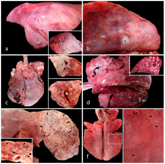 The gross pulmonary lesions of OPA. (a) The classical form of OPA in a sheep (case 12). The cranioventral areas of the lung (up to 70–80% of the pulmonary parenchyma) are replaced by a firm, white-to-light-purple mass. On the cut surface, there is a diffuse firm area, with several spaces filled with necrotic material. (b) The atypical form of OPA in a goat (case 3). A solitary, white, firm, raised nodule is observed in the caudal right lobe (asterisk). (c–f) Mixed forms of OPA in sheep. (c) Different OPA lesions in the cranial lobes of the same lung (case 15): diffuse white and firm areas with necrotic material (top right), and multiple white-to-grey well-demarcated nodules (bottom right). (d) The cranial portion of this lung presents lesions consistent with the classical form of OPA (diffuse, firm, pink areas) and the caudal portion with the atypical presentation (multifocal, white, firm, raised nodules) (case 21). (e) Numerous grey-to-white flat OPA lesions (case 4) in the right cranial lobe (arrowheads). (f) Multifocal pinpoint (1–2 mm in diameter) white lesions (case 5) of OPA (arrowheads).