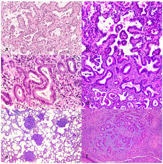 Microscopically, the OPA lesions were classified according to their architectural patterns as lepidic, papillary, acinar, or mixed (Table 1 and Figure 2). The lepidic subtype (3 cases) was characterized by a layer of cuboidal epithelium following an alveolar pattern (Figure 2a). The papillary subtype (six cases) presented exophytic growths of cuboidal-to-columnar cells arranged around a fibrovascular core (Figure 2b). The acinar subtype (5 cases) was characterized by palisades of taller columnar cells that formed tubular structures often surrounded by fibrovascular stroma (Figure 2c). Some of the acinar structures showed mucous differentiation. Mixed patterns were the most frequently identified (13 cases), and they were composed of a combination of the previously described subtypes or the intermediate forms between them (Figure 2d). In sheep with subtle 1–2 mm diameter pulmonary lesions (the mixed form of OPA), the diagnosis of OPA was only confirmed after histological examination (Figure 2e). In several cases, proliferative pulmonary nodules were composed of neoplastic cells associated with a moderate amount of extracellular matrix, with myxoid differentiation (fibromyxoid nodules, Figure 2f).