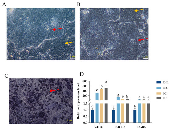 Morphology and identification of intestinal epithelial cell culture in vitro. The images of (A,B) show the morphology of intestinal epithelial cells (IEC) cultured for 24 h and 48 h observed under a microscope (20×), respectively. (C) The IEC staining for alkaline phosphatase staining after culturing IEC 48 h. (D) Marker gene expression for CHD1, KRT18, and LGR5 was used to identify IEC cells. DF1: fibroblast; JC: jejunum; IC: ileum; Red arrow: IEC; Yellow arrow: DF1. a,b,c,d means significant difference between groups (p < 0.05).