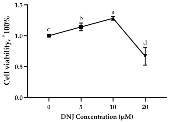 As shown in Figure 2, compared with the control group, cell viability was significantly increased under the treatment of 5 μM and 10 μM concentrations of DNJ (p < 0.05) and significantly decreased under the treatment of 20 μM concentration of DNJ (p < 0.05).