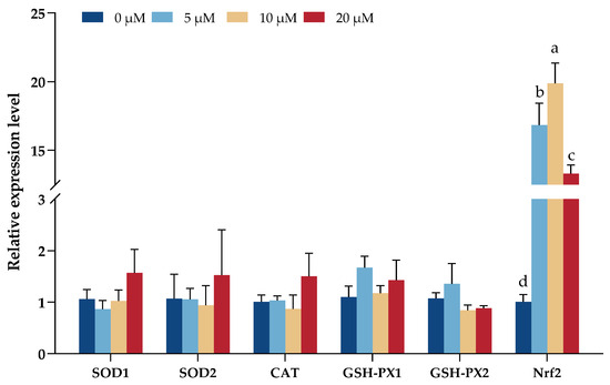 There were no significant changes in the marker genes examined except Nrf2, which showed a significant increase under DNJ treatment (p < 0.05), especially under the 10 µM DNJ treatment group (Figure 4).