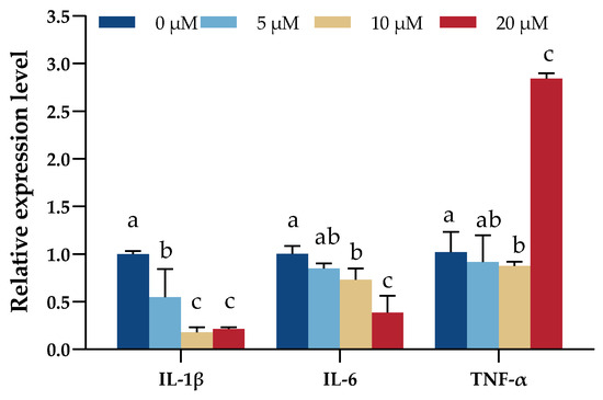 The analysis of the marker gene expressions showed that the treatment of DNJ with 10 μM and 20 μM concentrations significantly reduced the mRNA expression levels of IL-1β and IL-6 (p < 0.05), but 20 μM DNJ treatment significantly increased the mRNA expression levels of TNF-α (p < 0.05, Figure 5).