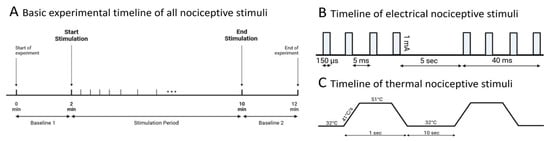 Experimental timeline for EEG recordings in chicken embryos. (A) The total duration of a single recording was 12 min, starting and ending with 2 min of baseline EEG recordings. The stimulation duration was 8 min. (B) Electrical stimulation was administered at 1 mA, pulse duration: 150 µs, inter-pulse interval: 5 ms, pulse train: 40 ms at 5 s, 90 repetitions/stimulus. (C) Thermal stimuli were given at 51 °C with a heating rate of 41 °C/s for 1 s and repeated every 10 s for 40 times. Basal temperature was kept at 32 °C.