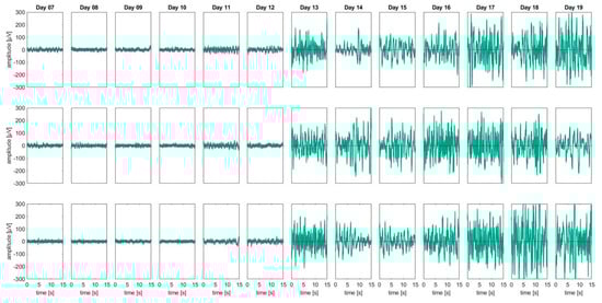 In Figure 2, representative 15 s sections of raw EEG data from three randomly selected datasets (3 × 13 embryos) are shown for D7–D19. The onset of prominent EEG activity can be clearly attributed to ED13.